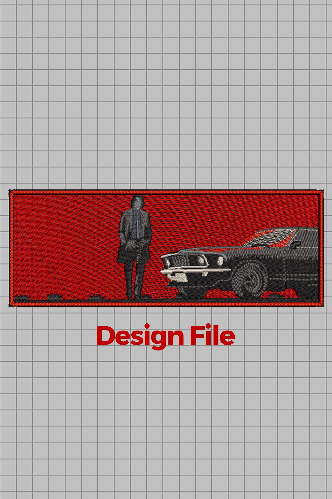 - High-Precision Embroidery — vivid red backdrop with detailed John Wick & car graphic